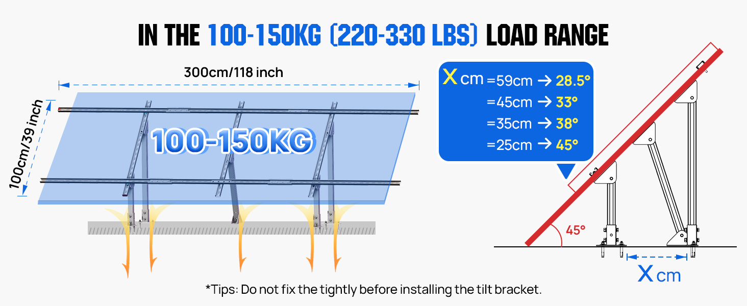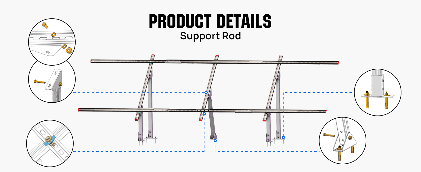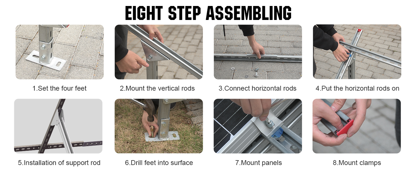 Es ideal para instalaciones más grandes, como suelo, techo plano, cabinas y cobertizos de patio trasero. En cualquier lugar donde el montaje en techo no sea una posibilidad, se puede aplicar este soporte para panel solar.