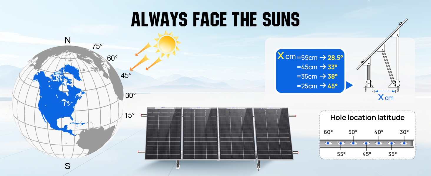 Ángulo ajustable de 30 ° a 45 ° grados, ángulo recto para obtener la mejor energía solar. Fijado al viento y la lluvia resistentes al suelo, protege bien el panel solar y es fácil de limpiar.
